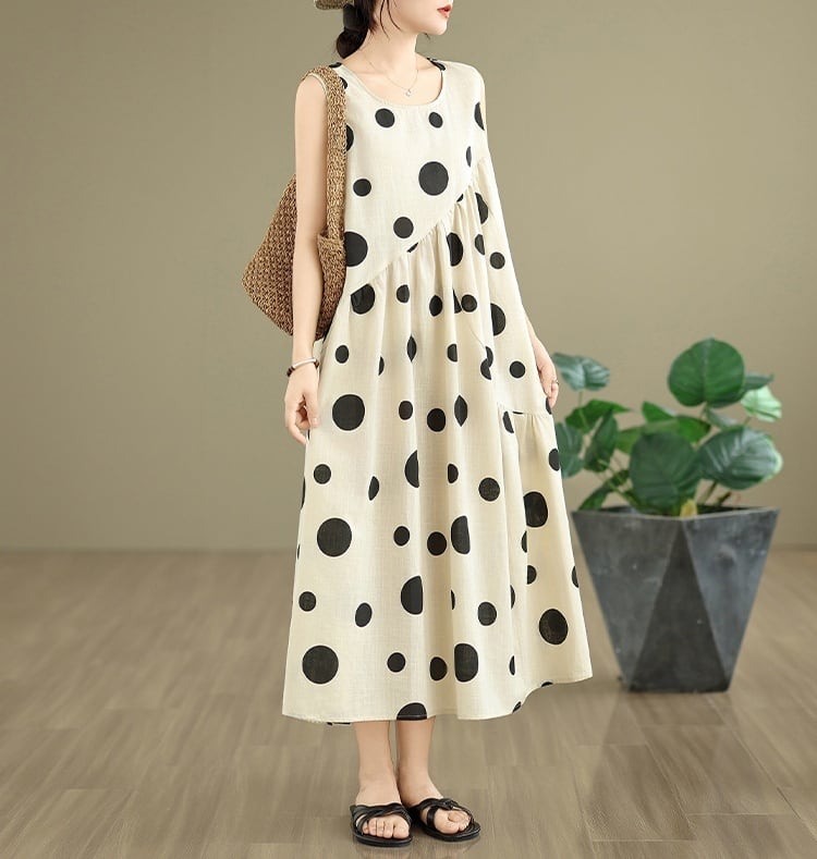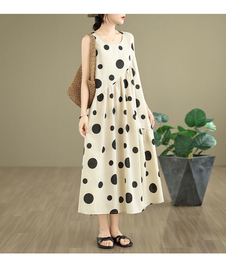 アートで若返り感のあるドット柄のアシンメトリー拼接(パッチワーク)フレアベストドレス<ins-11853>