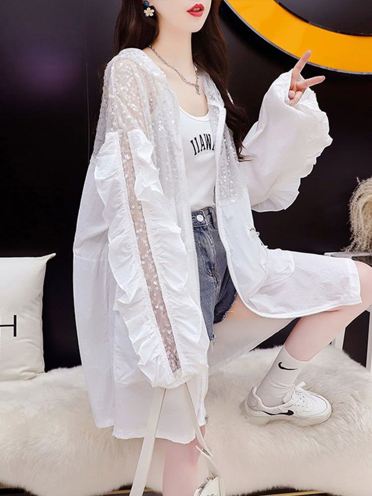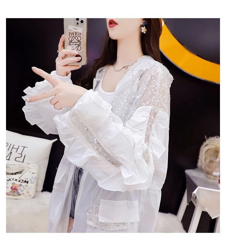 美人度アップ ファッション 透け感 日焼け対策 ピンク プリント スパンコール パーカー コート<ins-8058>