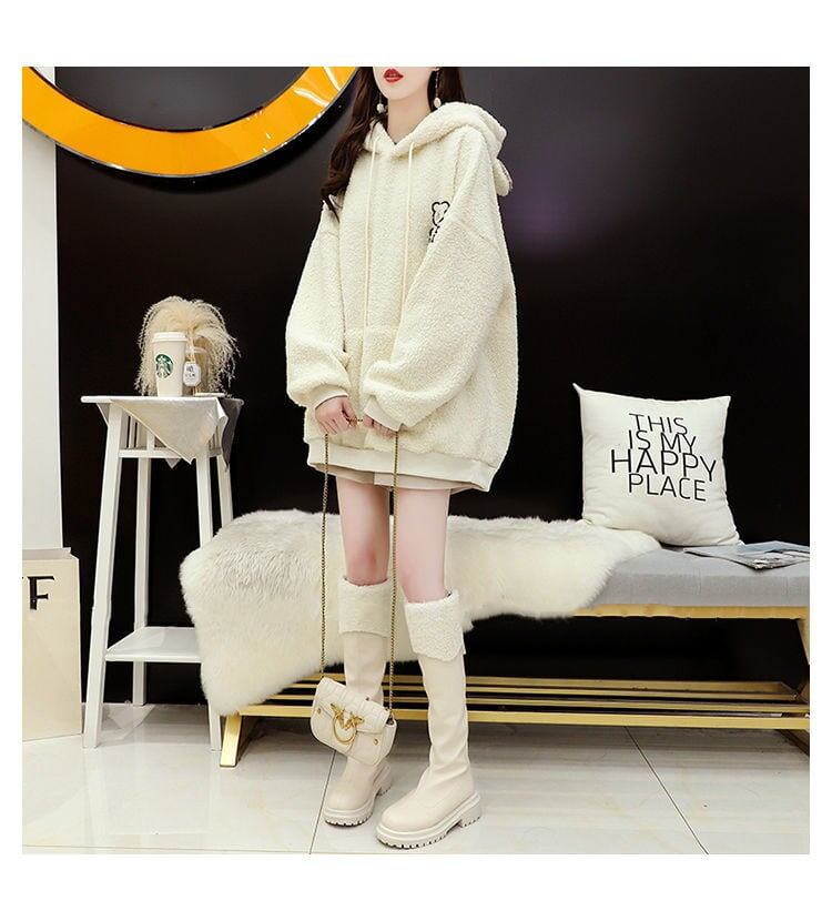 大人可愛いクマちゃんロゴもこもこ厚手フード付きパーカー全3色<ins-4696>