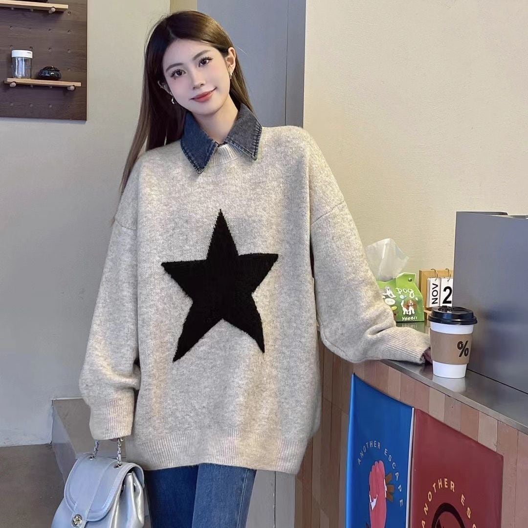 レイヤード風 星柄ロゴ厚手ゆったりニットトップス全3色<ins-4704>