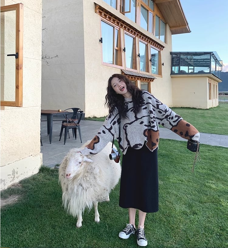 絶対欲しい可愛い熊柄ゆったりニットセータートップス <ins-4671>