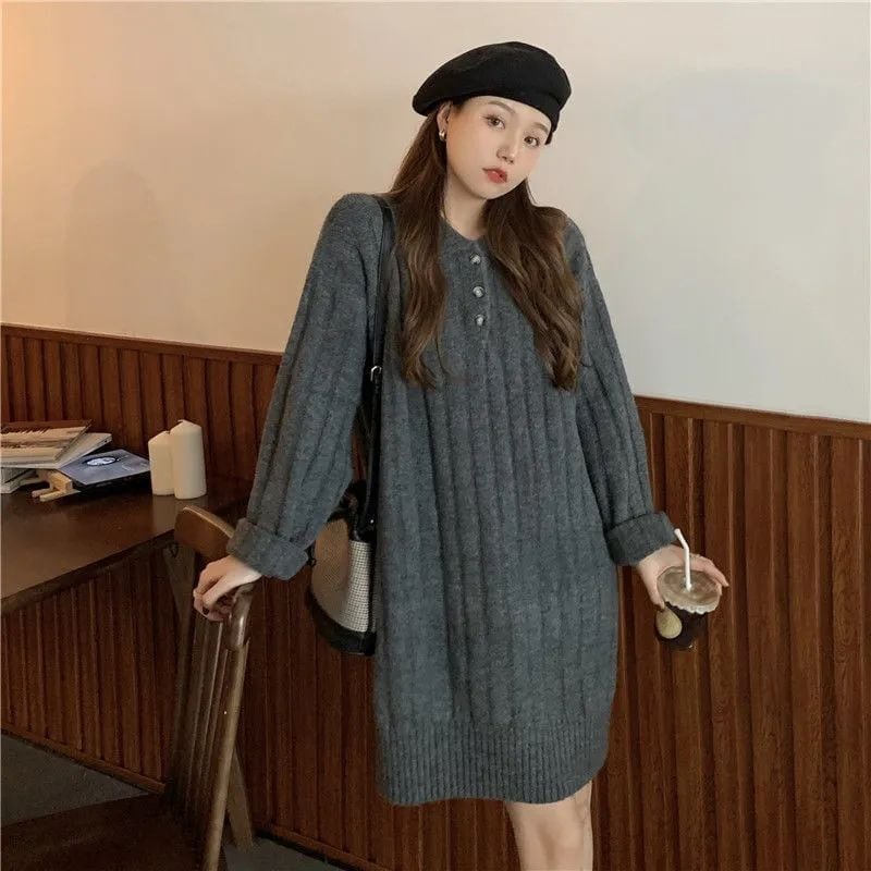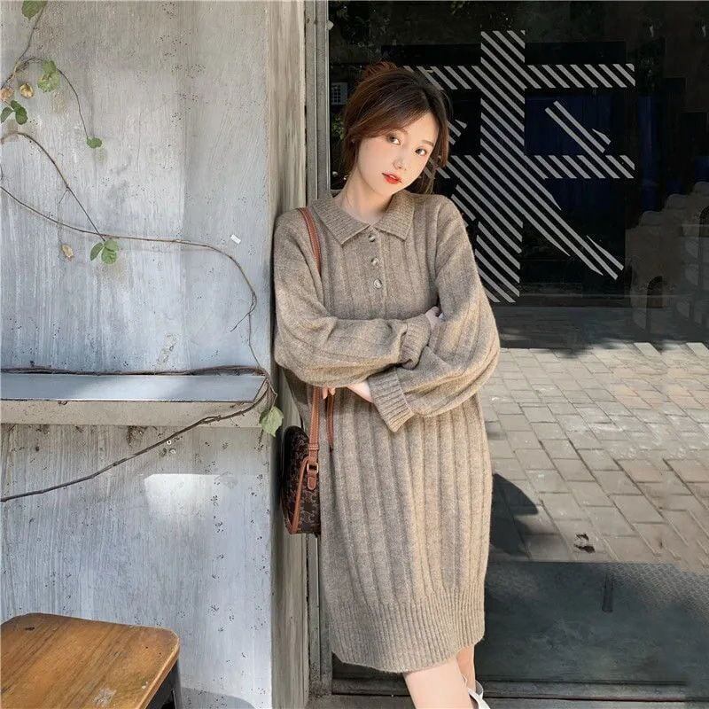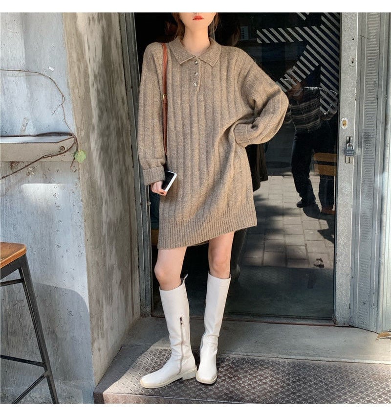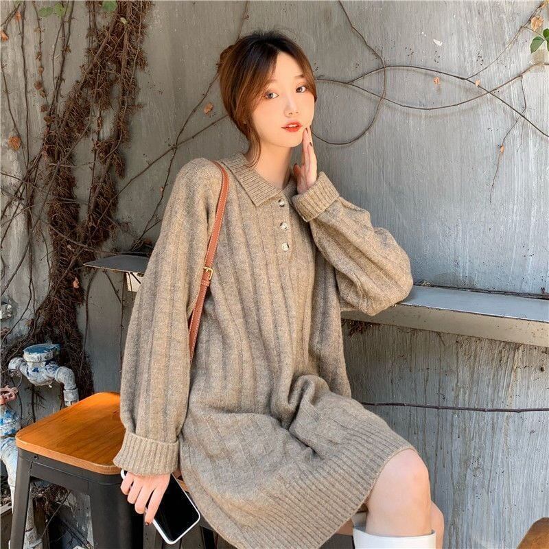 優しい雰囲気 折り襟ゆったりニットワンピース全2色 <ins-4660>