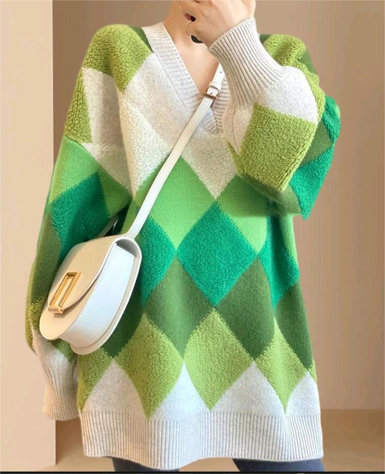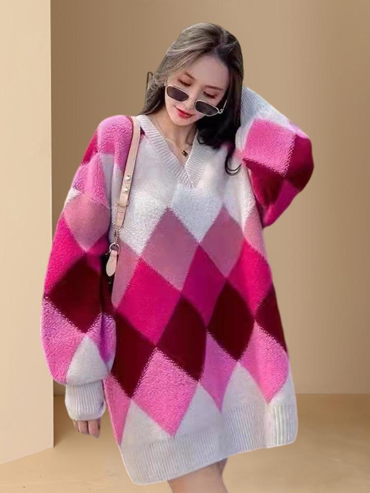 超人気ダイヤ柄ニットセーター厚手ゆったり全2色<ins-4654>