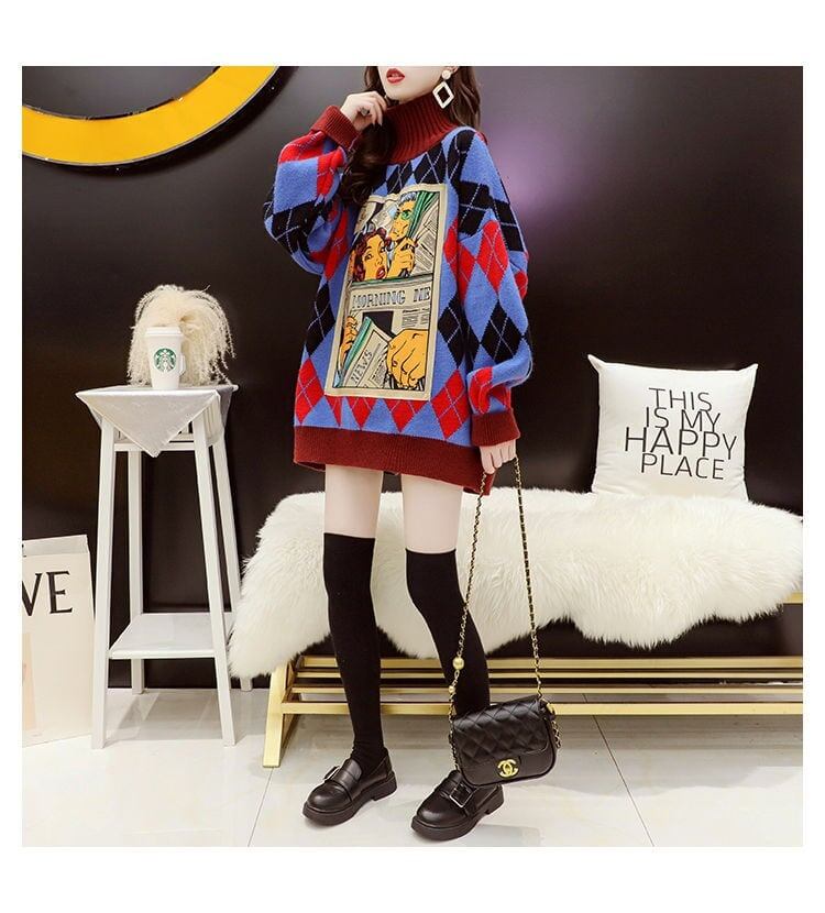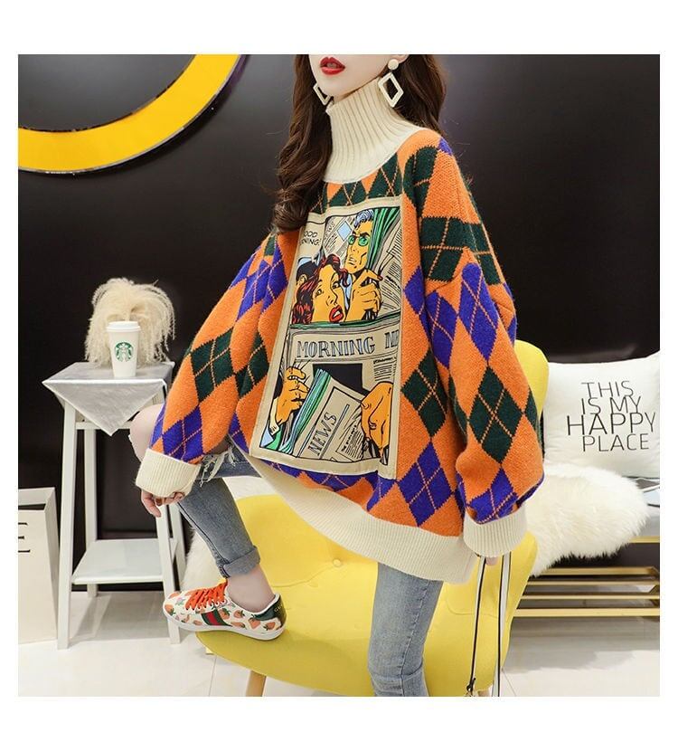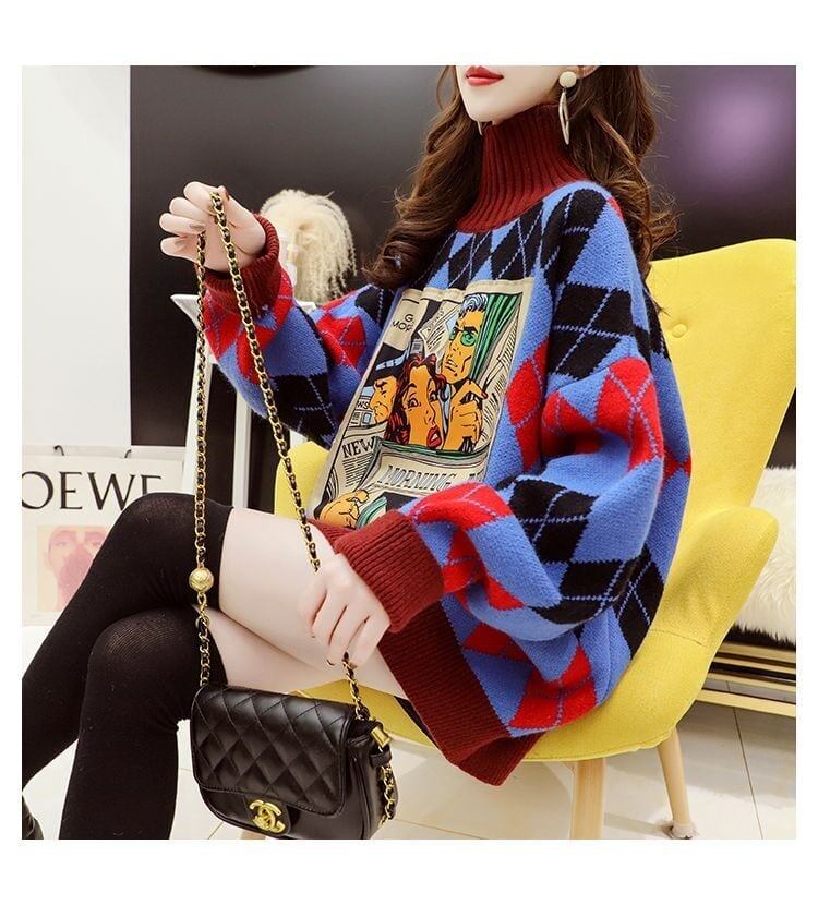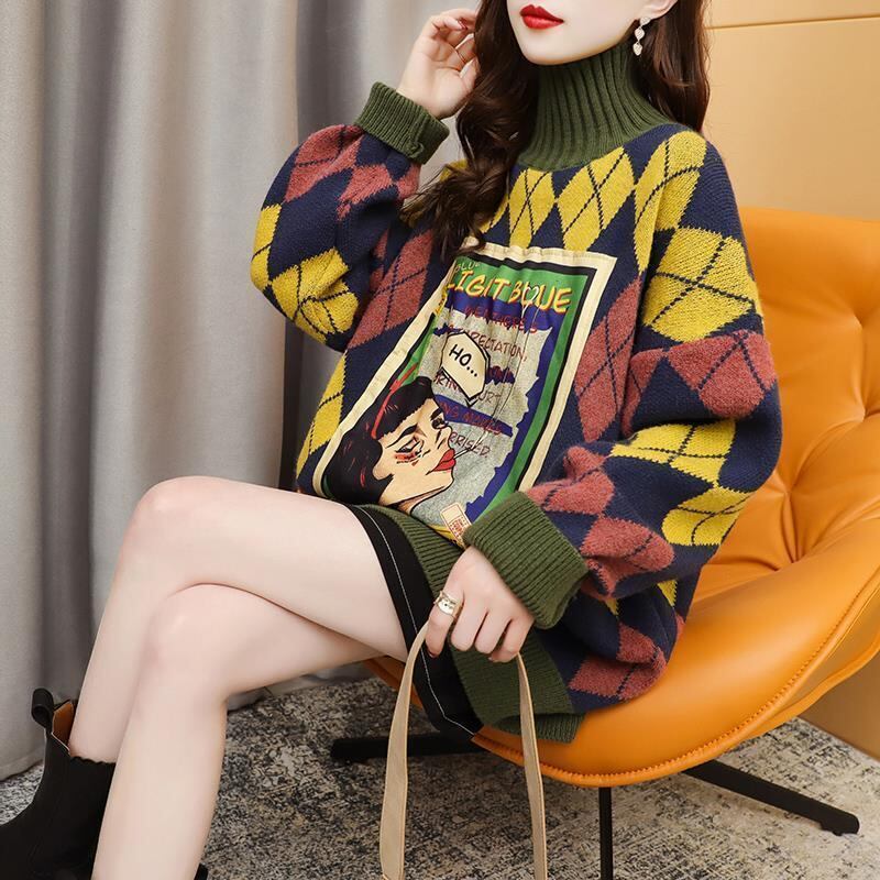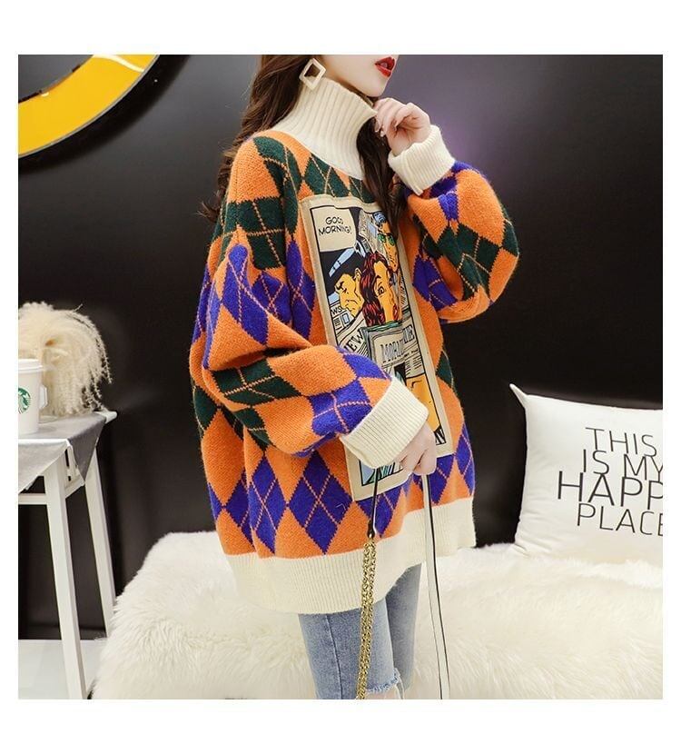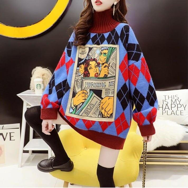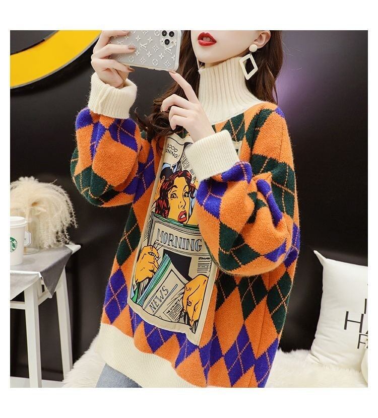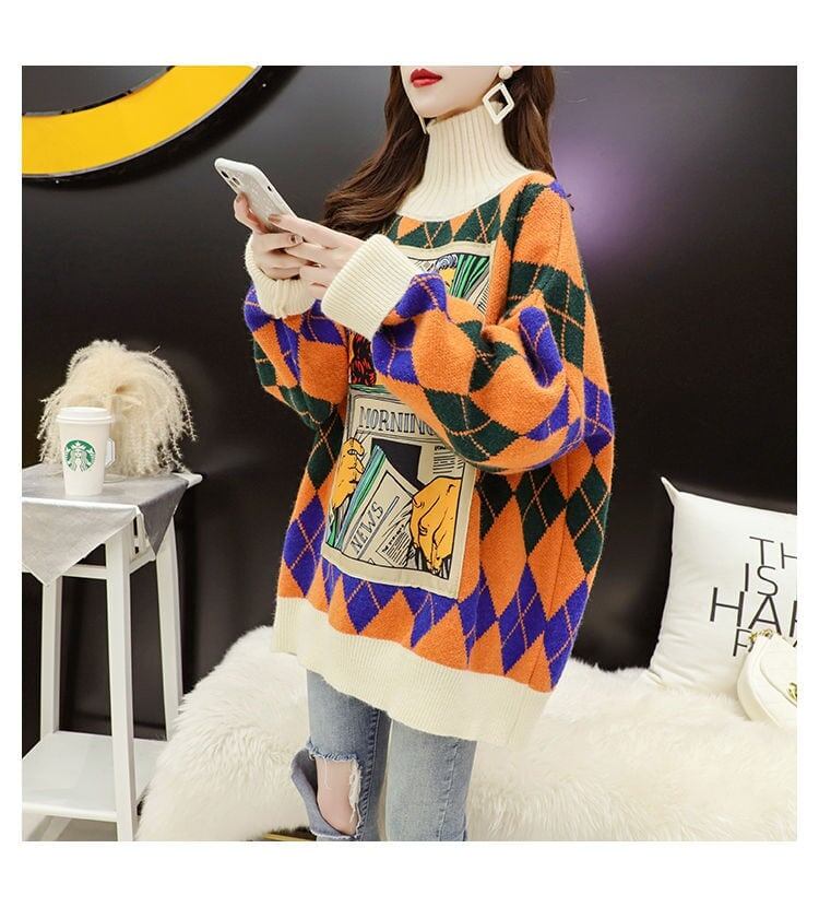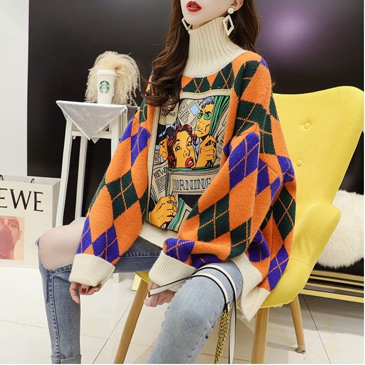 超人気配色チェック柄グラフィックロゴニットセーターハイネック3色あり<ins-4328>