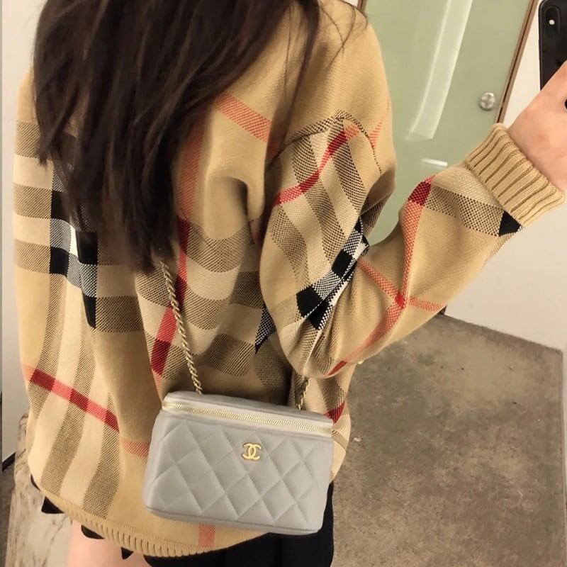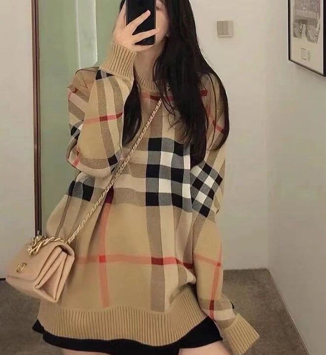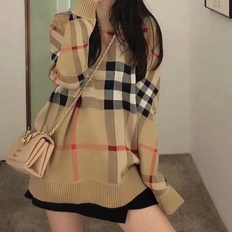 レトロ オシャレ度満点 ラウンドネック チェック柄 長袖 ニット セーター<ins-2530>