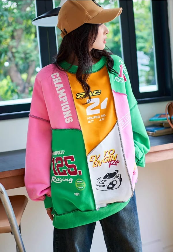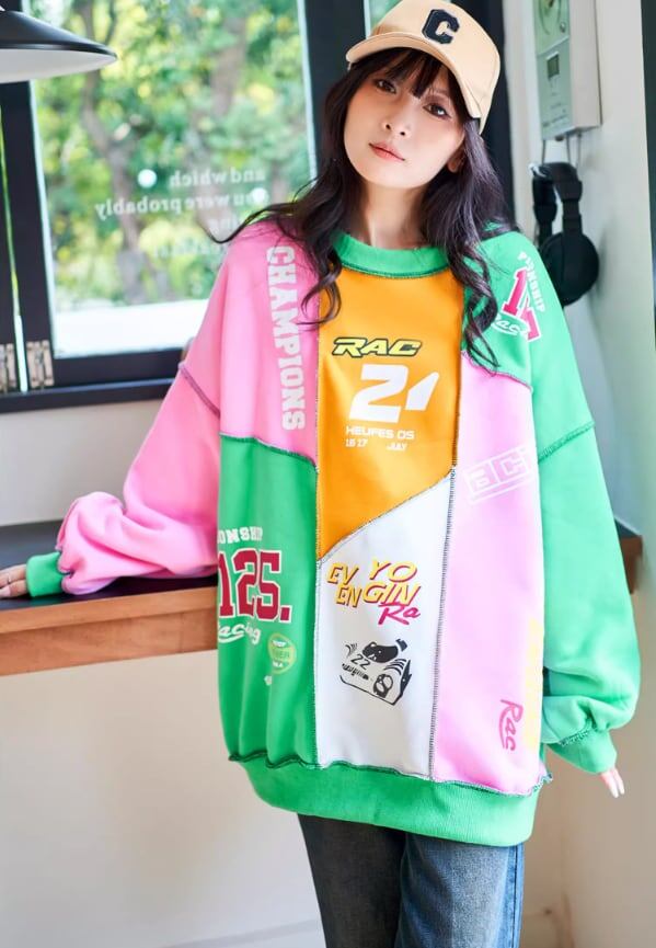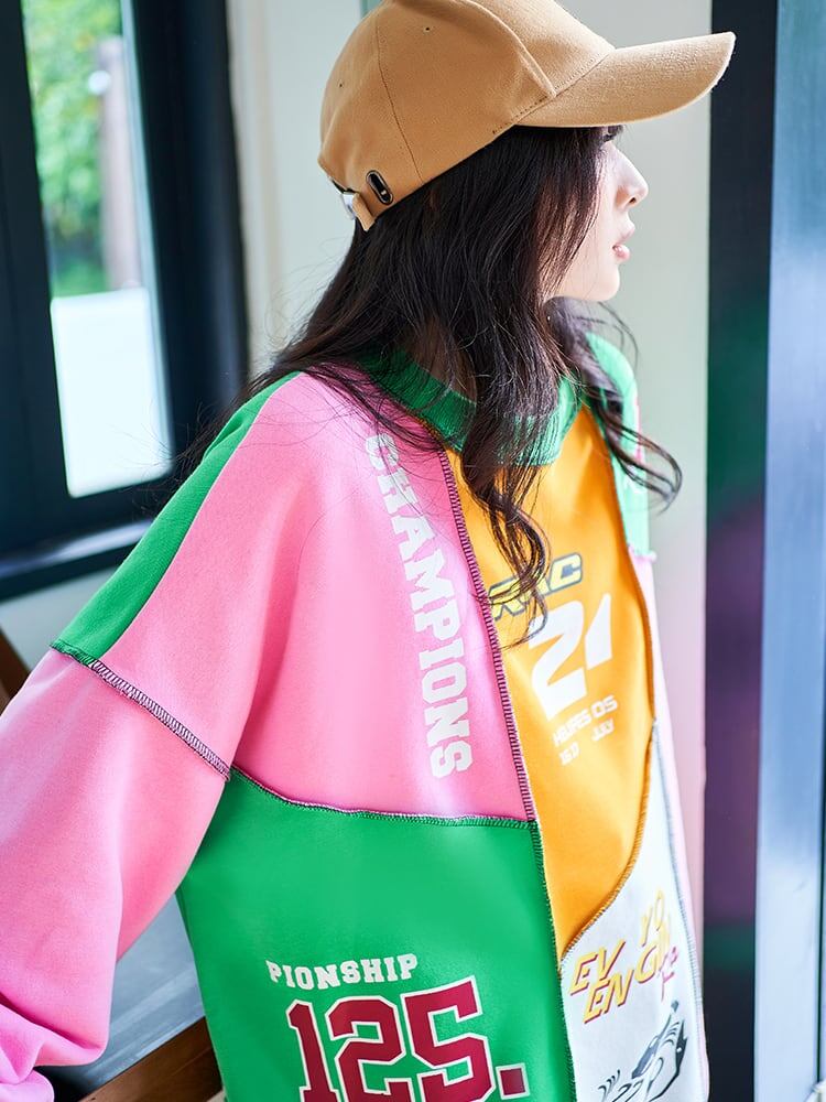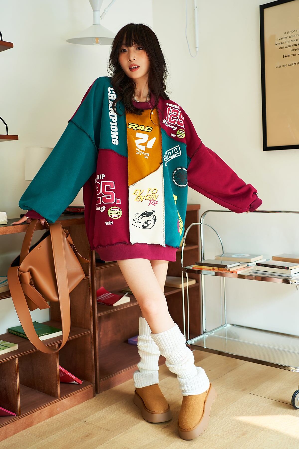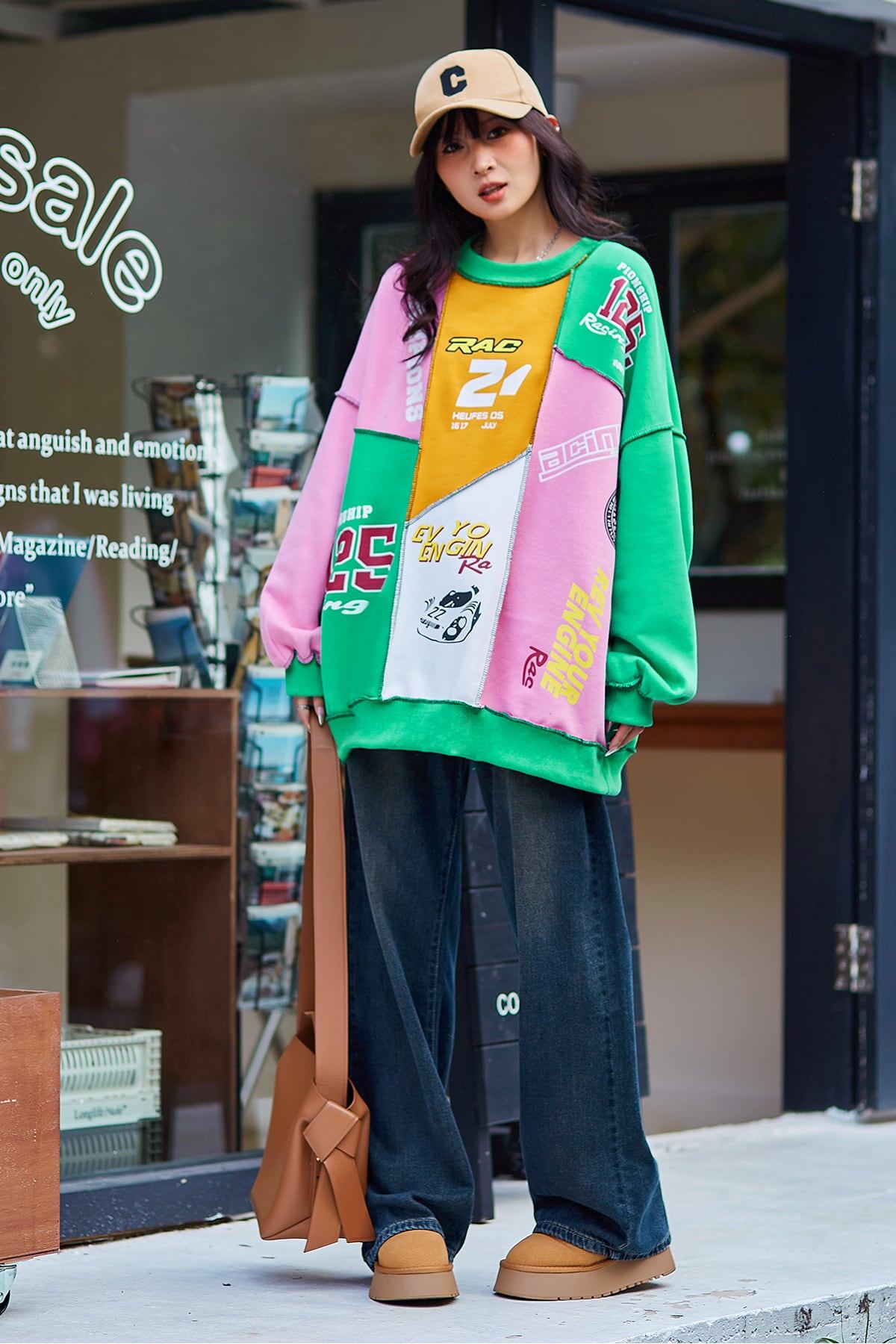 主役級プリントオーバーサイズ 切り替えカラーマッチング裏起毛スウェット<ins-4545>