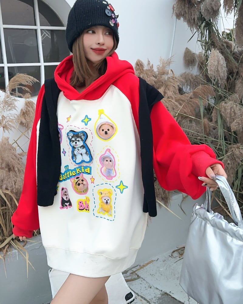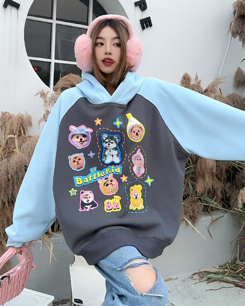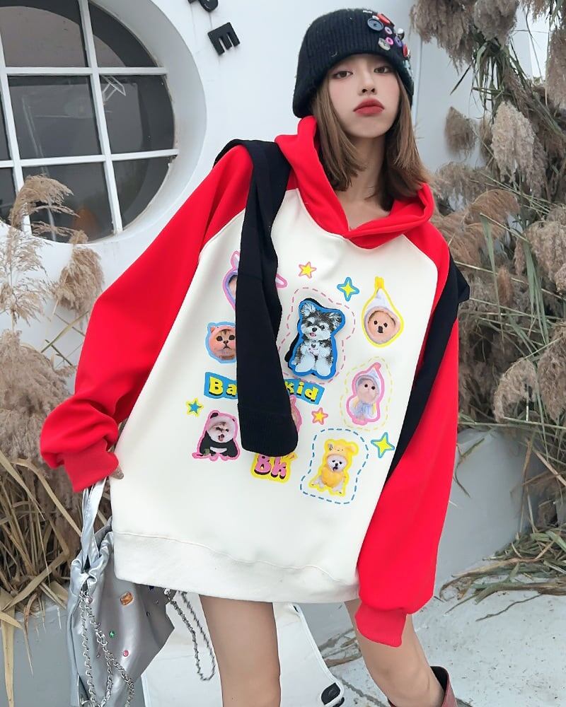 超人気商品猫柄犬柄ロゴ厚手ラグランパーカー全3色オーバーサイズトップス<ins-4473>