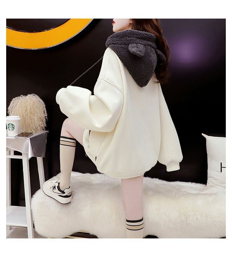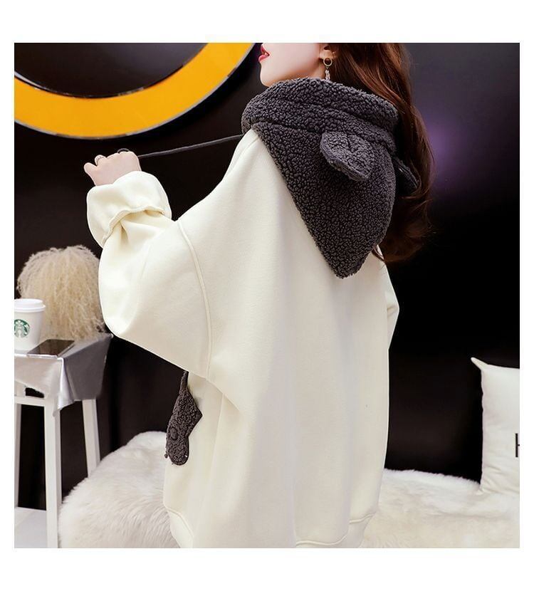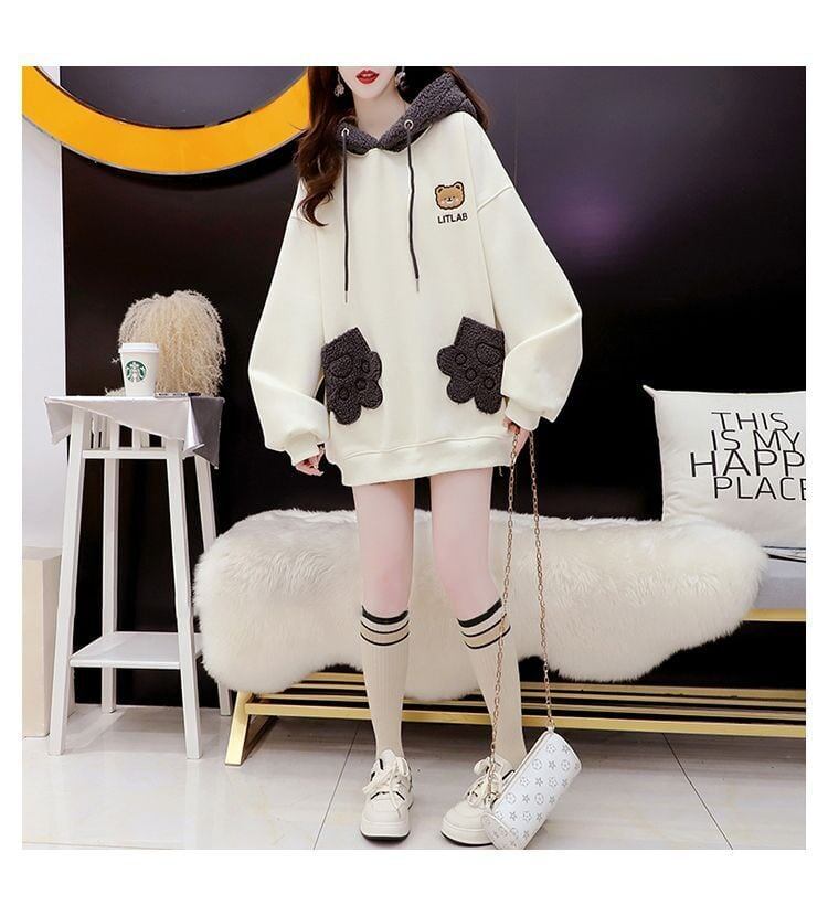 絶対流行熊柄ロゴ切り替え裏起毛パーカー全2色<ins-4426>