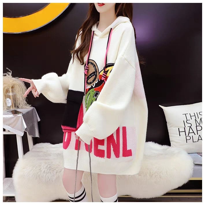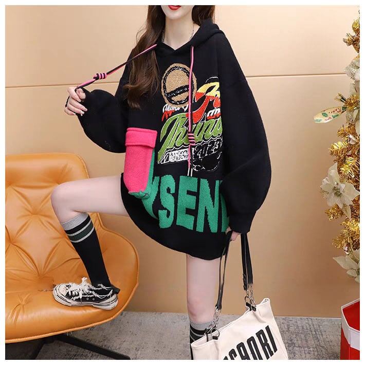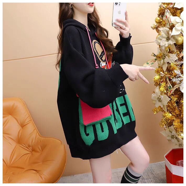 好感度100%アルファベットロゴフード付きジャカードニットパーカー二色ありトップス<ins-4398>