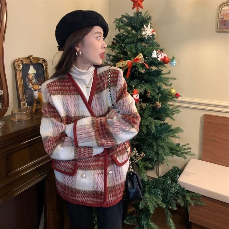 チェック柄 厚手ツイードジャケットトップス2色あり<ins-4351>