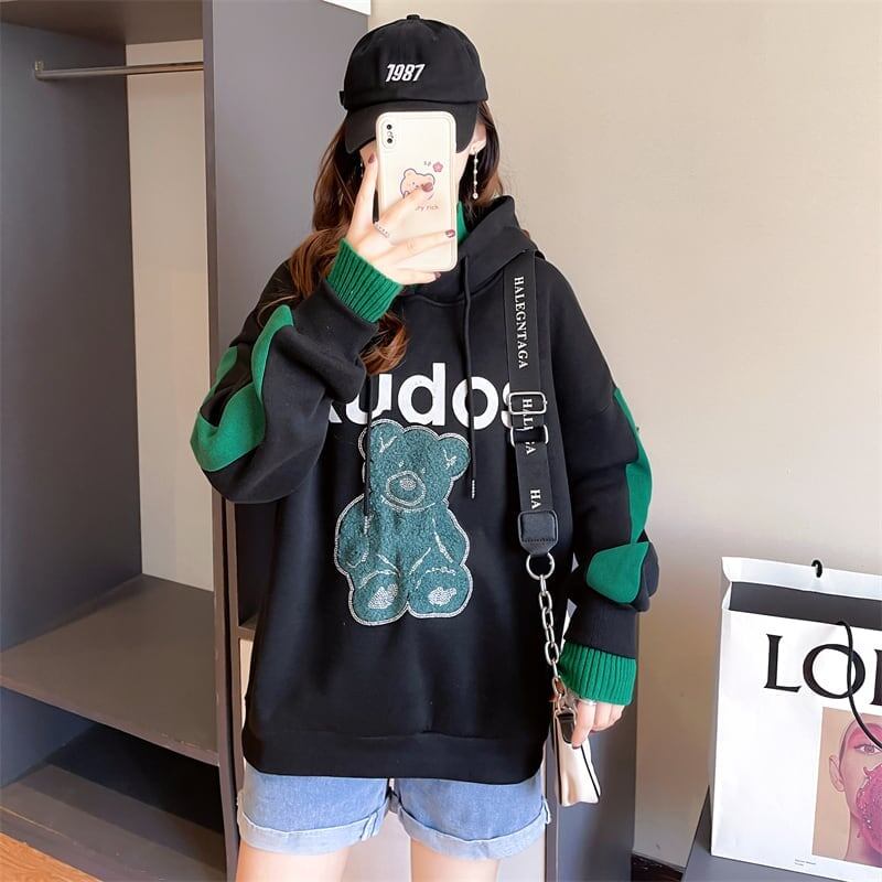 スタイルアップ配色ベア切り替え裏起毛フード付きパーカー二色あり<ins-4061>