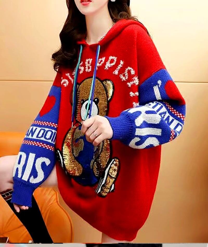 ファッションスパンコールベア 切り替えフード付きニットパーカー三色あり<ins-4029>