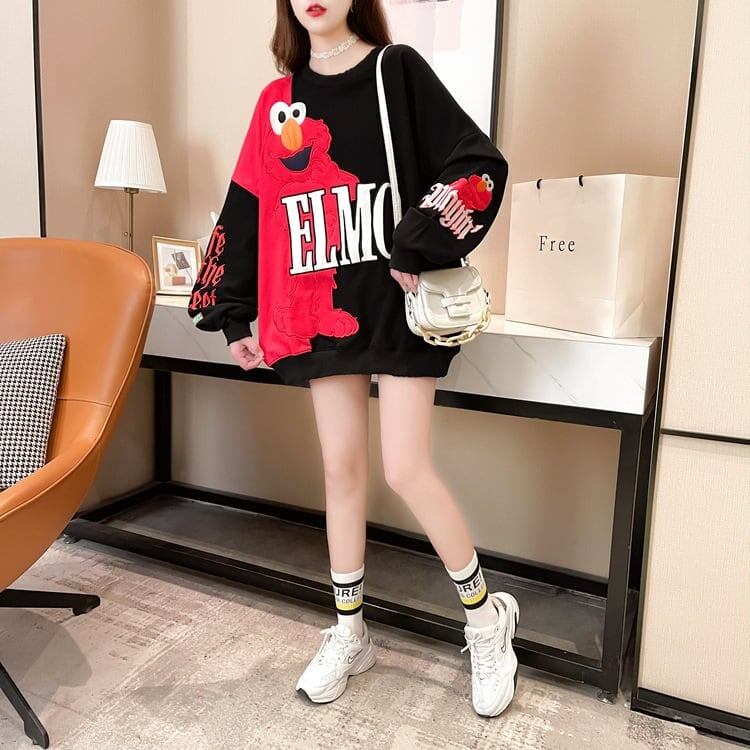 ゆったりとした重工業刺繍漫画長袖トップ<ins-5083>