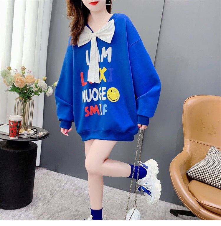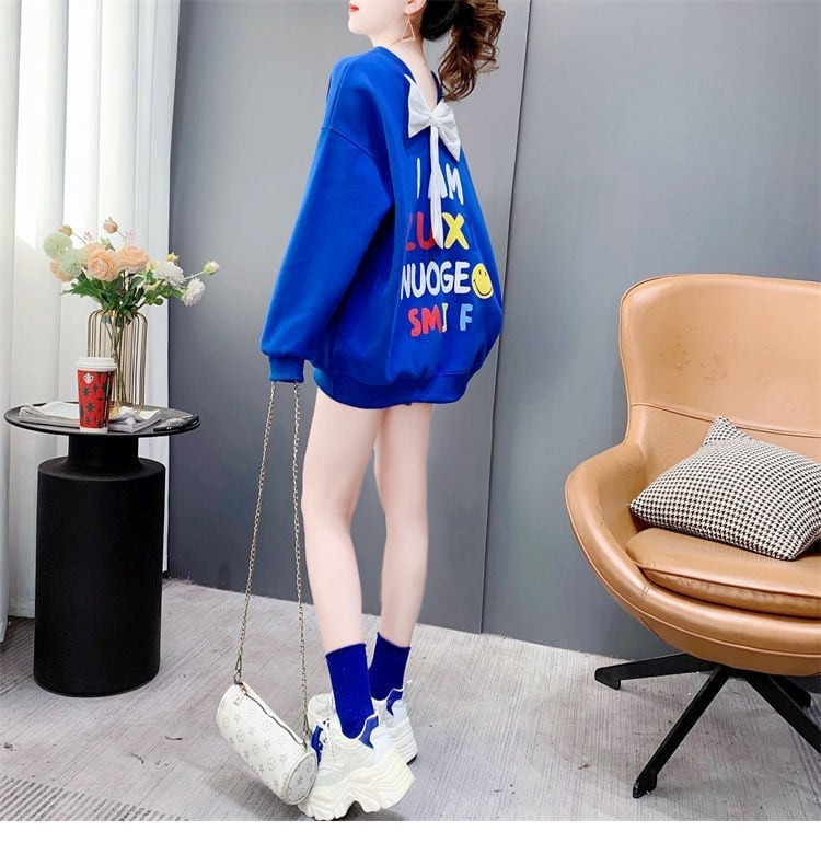 【半額!期間限定!!】着回し力抜群 2WAY リボンスマイルマーク 虹色アルファベットプリント三色スウェット<ins-4101>