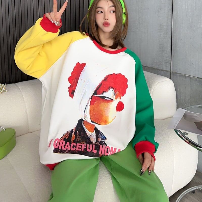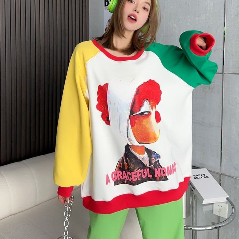 【半額!期間限定!!】デザイン性抜群 カラーマッチング グラフィックプリント オーバーサイズスウェット<ins-4088>