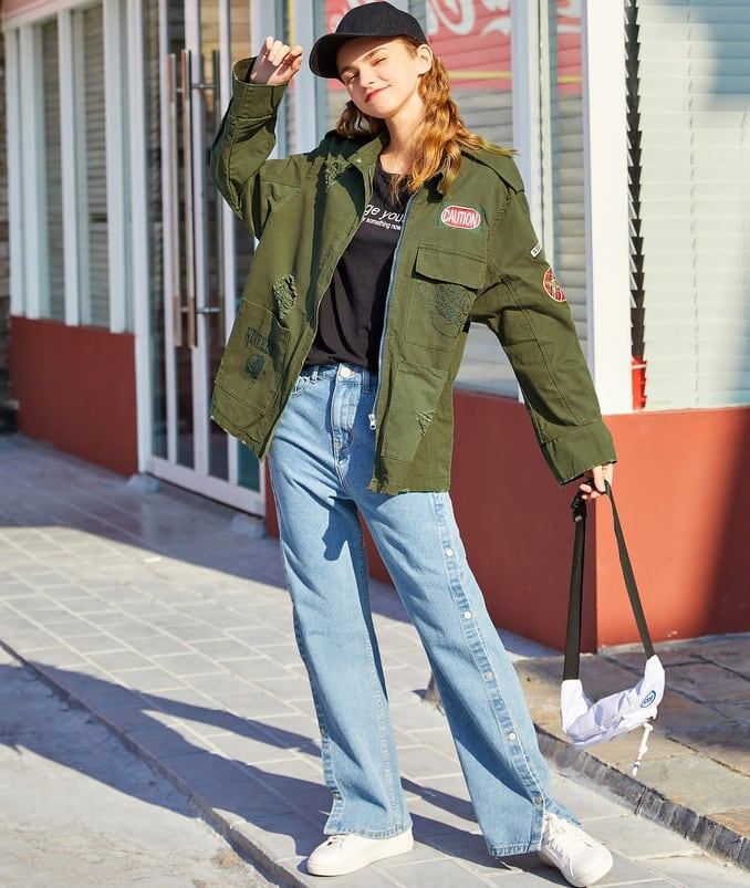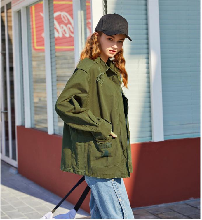 スタイルアップ ダメージ加工 ポケット アルファベットプリント カラーデニムジャケット<ins-4097>