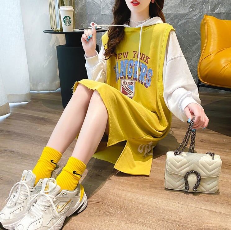 おすすめ レイヤード グラフィック 四色 フード付き ロングパーカー<ins-4044>