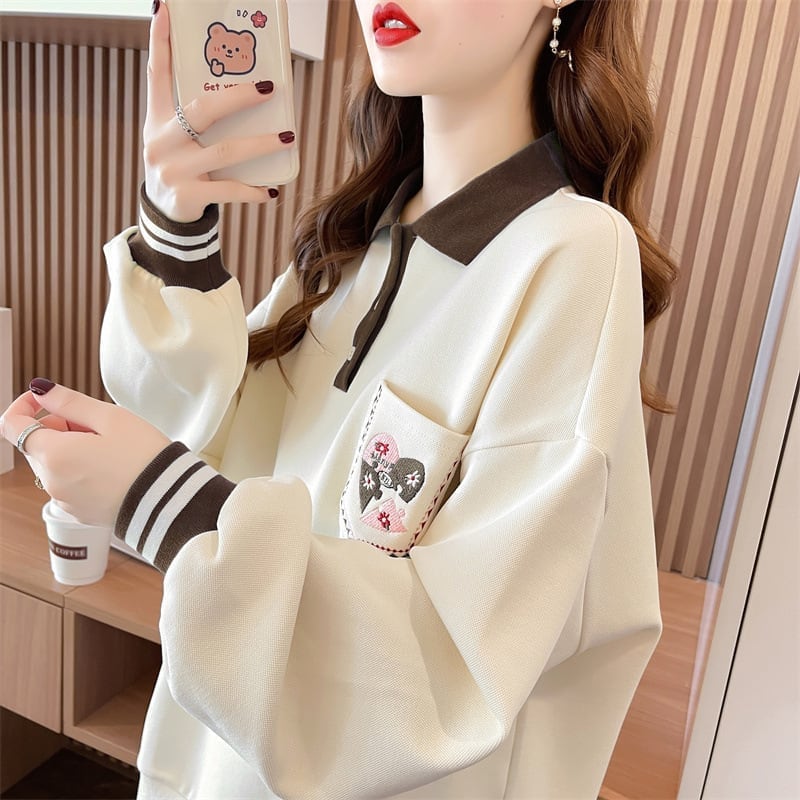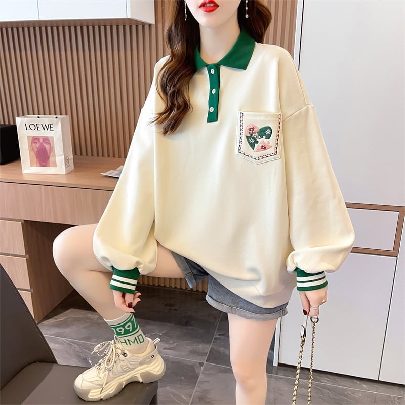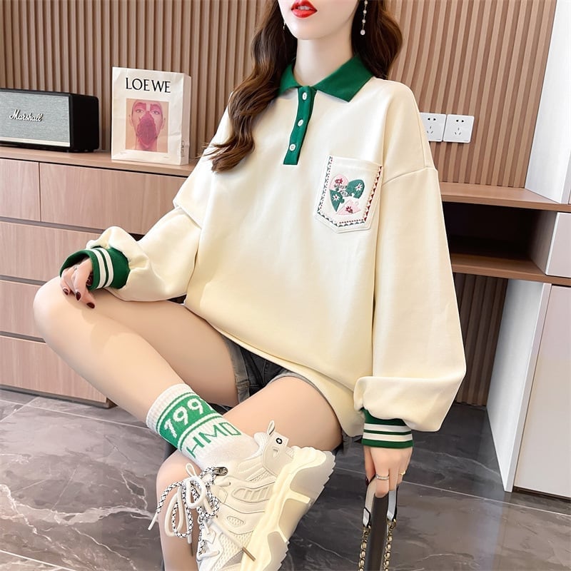 絶対欲しい ポロネック ポケット 配色 スウェットトップス<ins-4049>