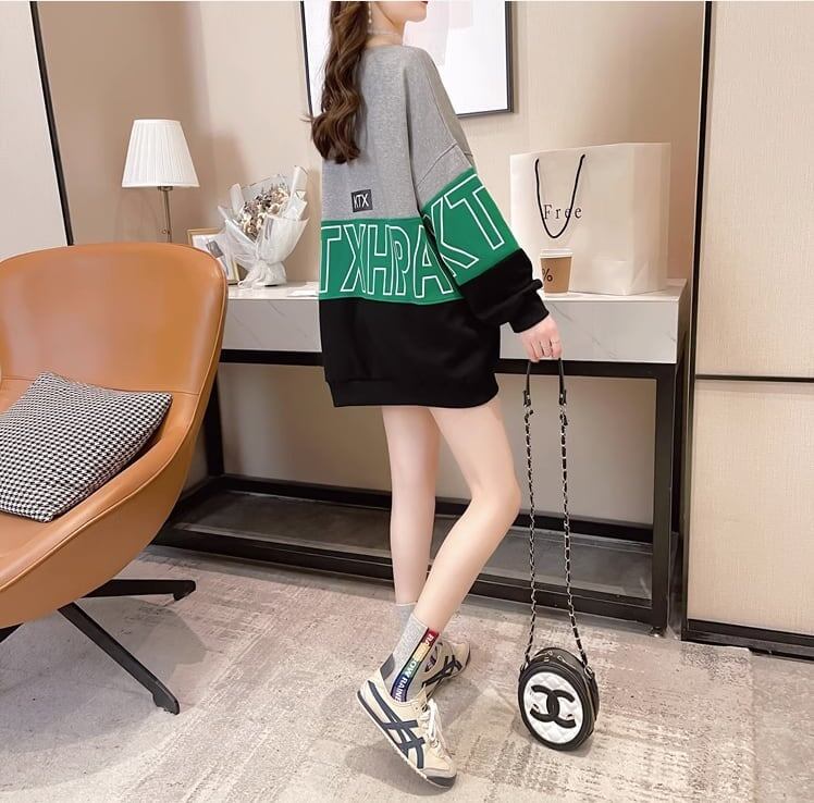 【秋の初めの割引!!】韓国風カラーマッチング漫画文字刺繍ミドル丈トップス<ins-5053>
