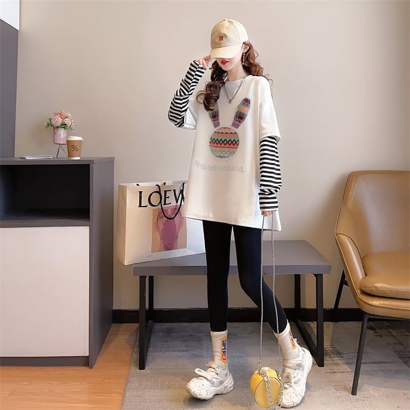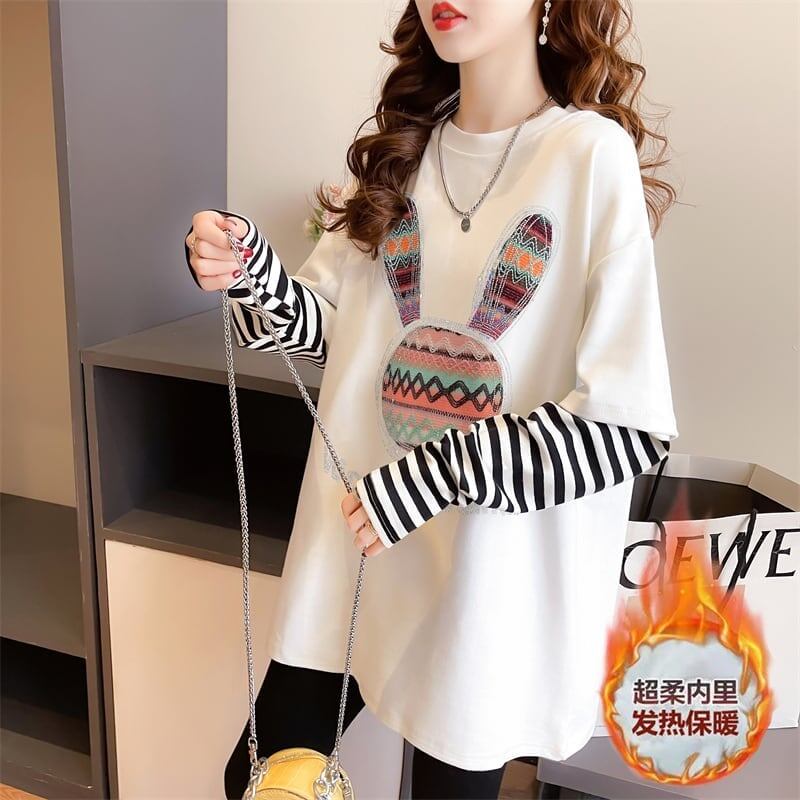 組み合わせやすい ストライプ柄 ウサギちゃん レイヤード 二色 長袖Tシャツ <ins-4006>