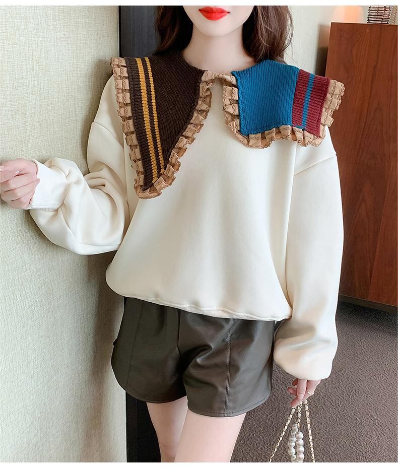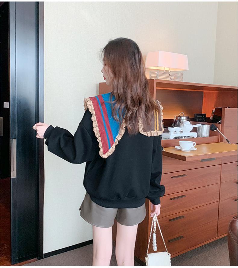 【秋の初めの割引!!】好感度UP 折り襟 フリル 二色 配色 スウェット長袖Tシャツ<ins-3999>