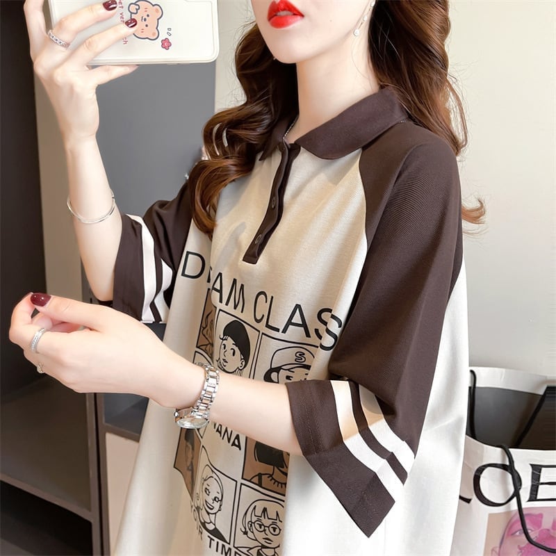 早い者勝ち POLOネック グラフィック プリント ロング ラグランTシャツ ゆったりワンピース<ins-4027>