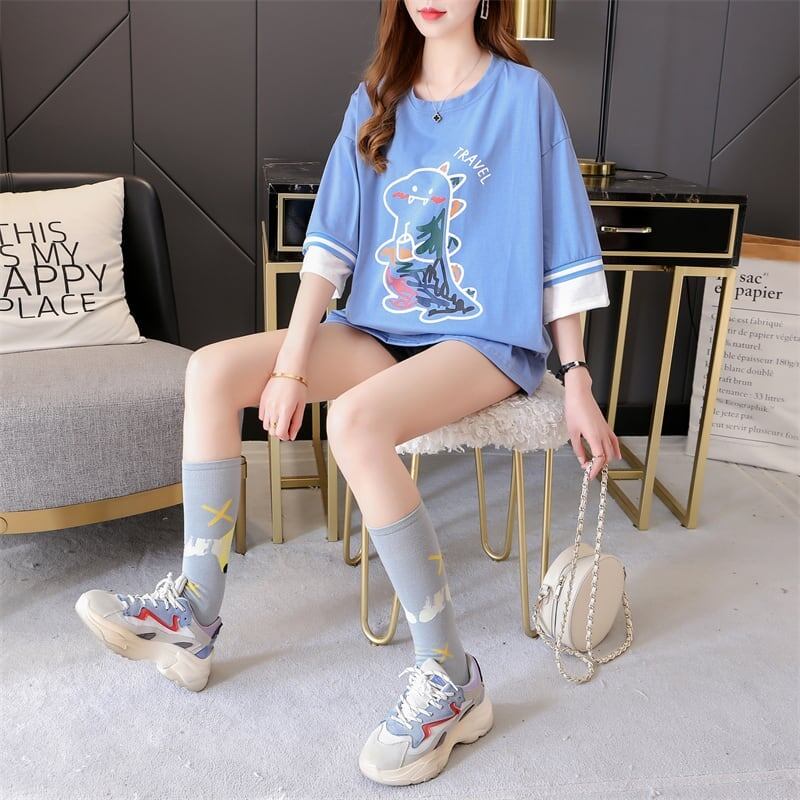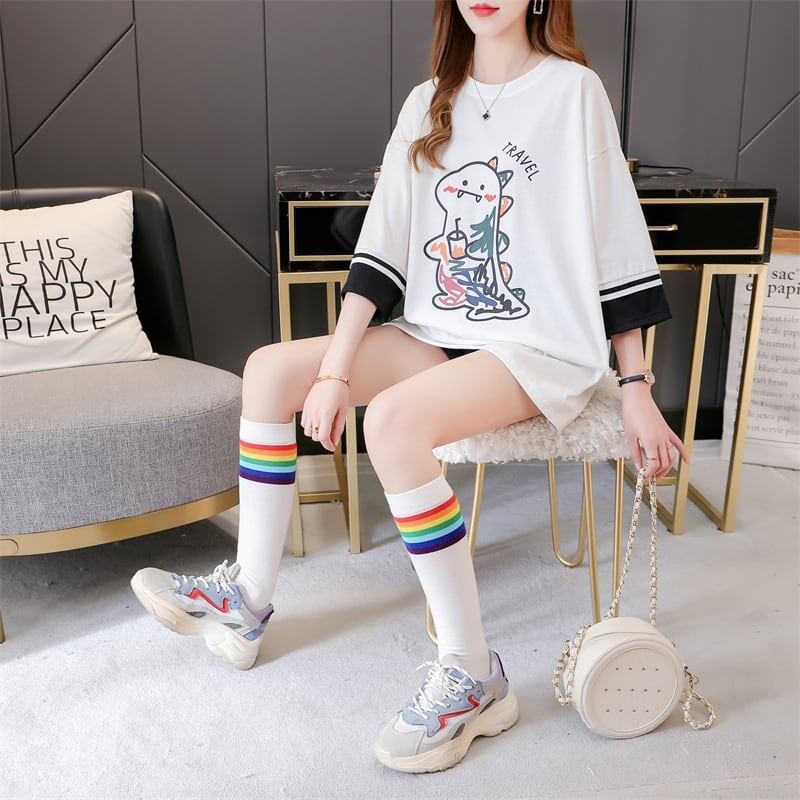 合わせやすい ラウンドネック アルファベット プリントTシャツ ゆったり ワンピース<ins-3992>