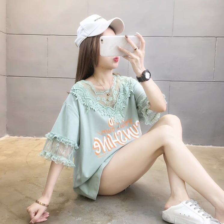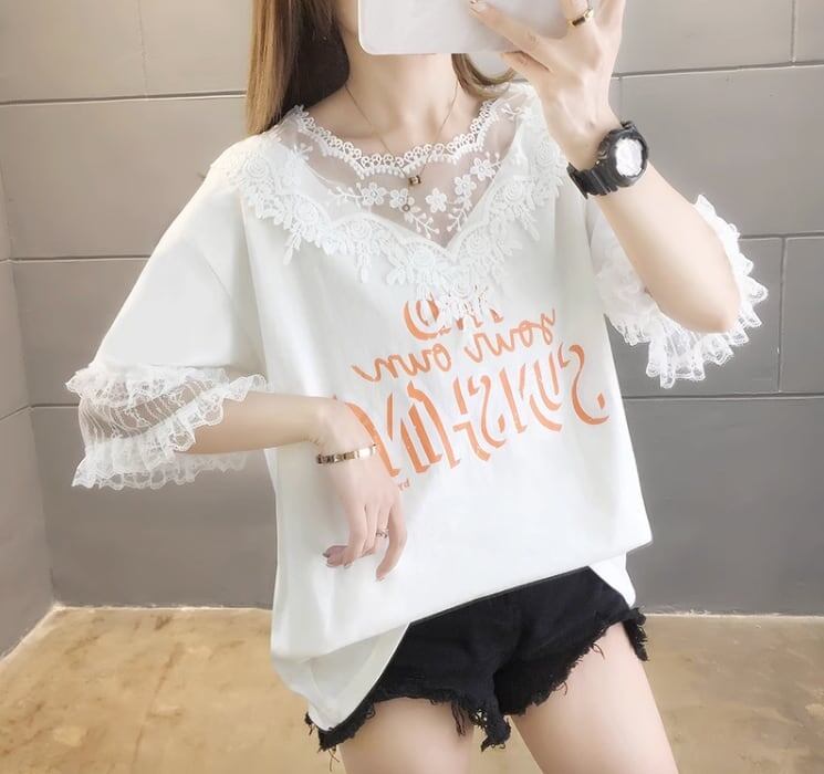 エレガントなレースステッチ半袖Tシャツ<ins-3030>