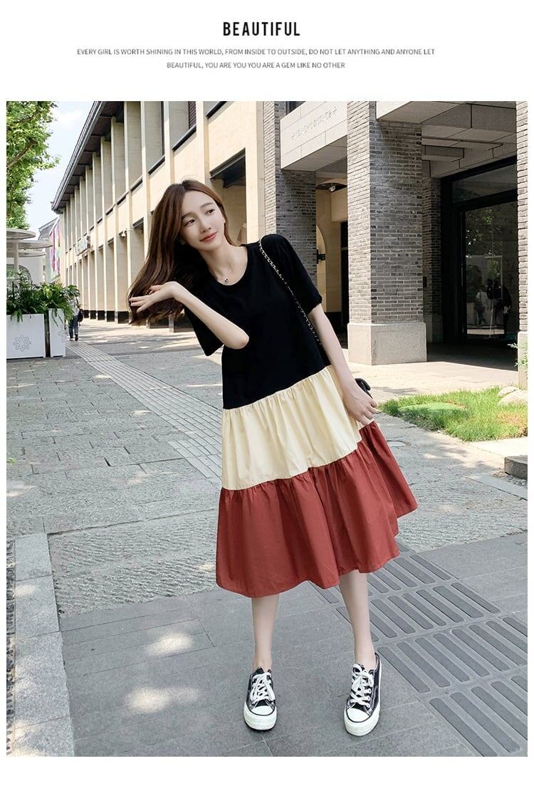 超人気 ラウンドネック 切り替え 配色 二色 ゆったりワンピース <ins-3046>