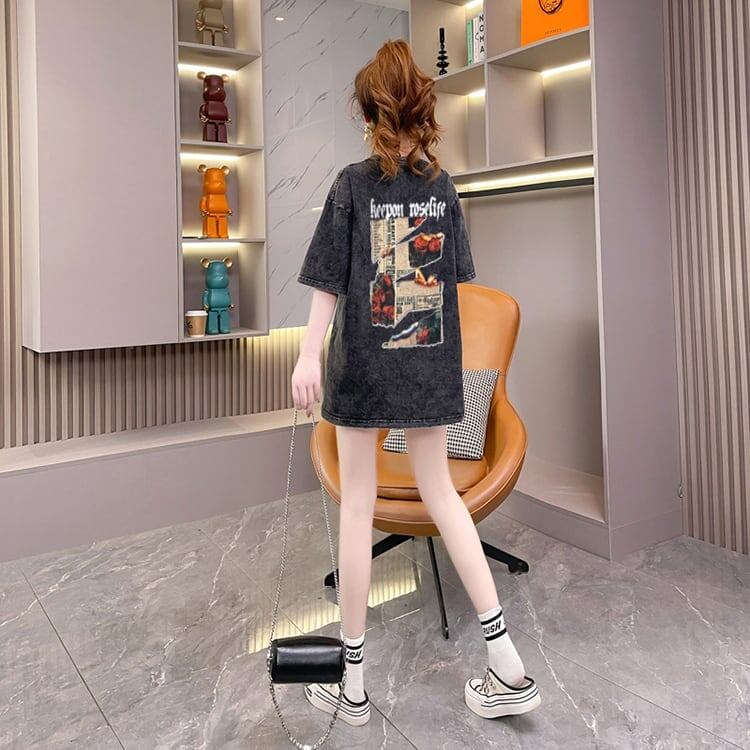 大注目 ヴィンテージ加工 プリントTシャツ ゆったり半袖<ins-3021>