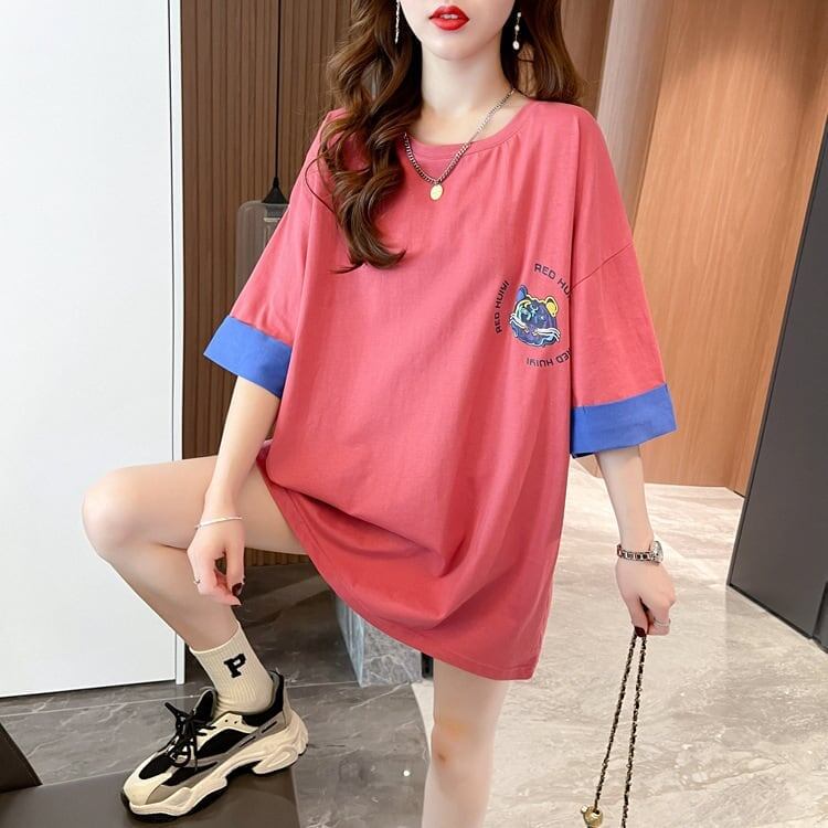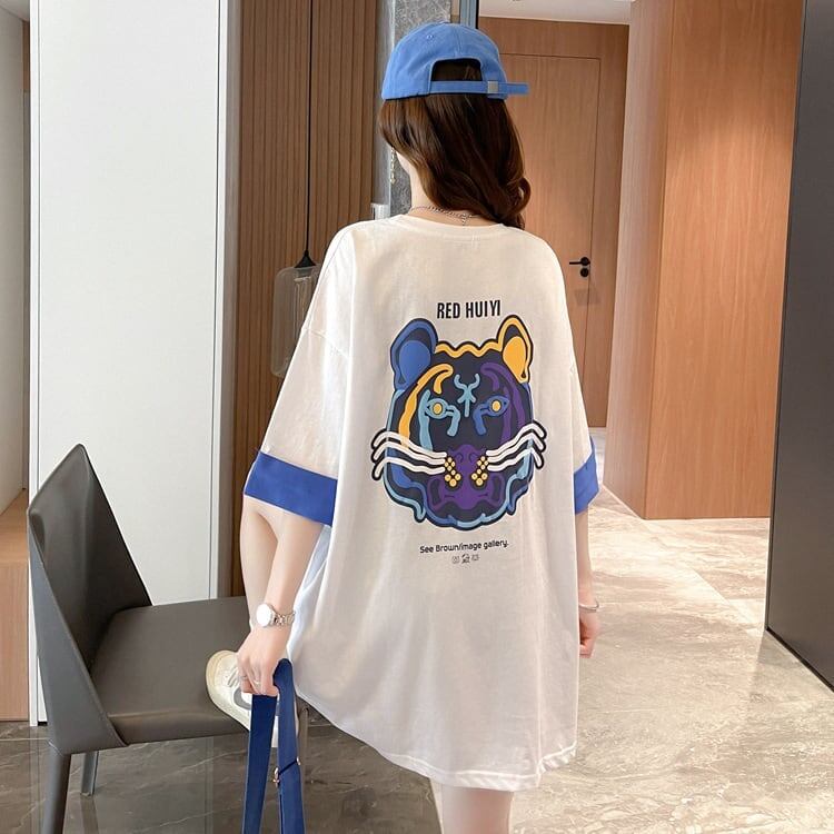 韓国系 ラウンドネック ドロップショルダープリント ロング Tシャツ 三色 ゆったり半袖<ins-3011>
