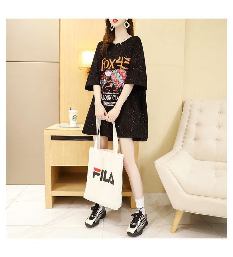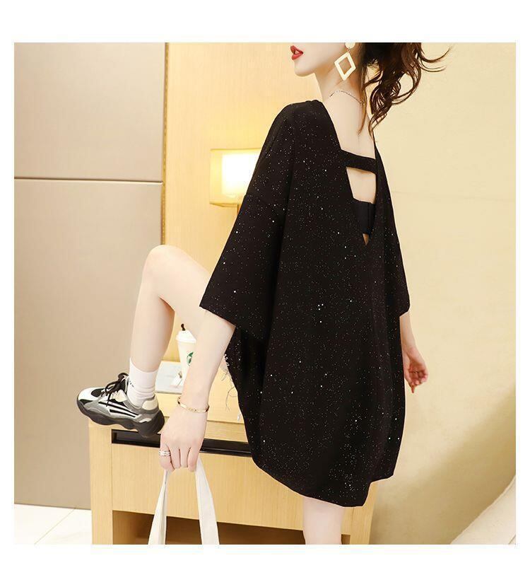 好感度UP バックオープン プリント ロング Tシャツ ブラック ゆったり ワンピース<ins-3001>