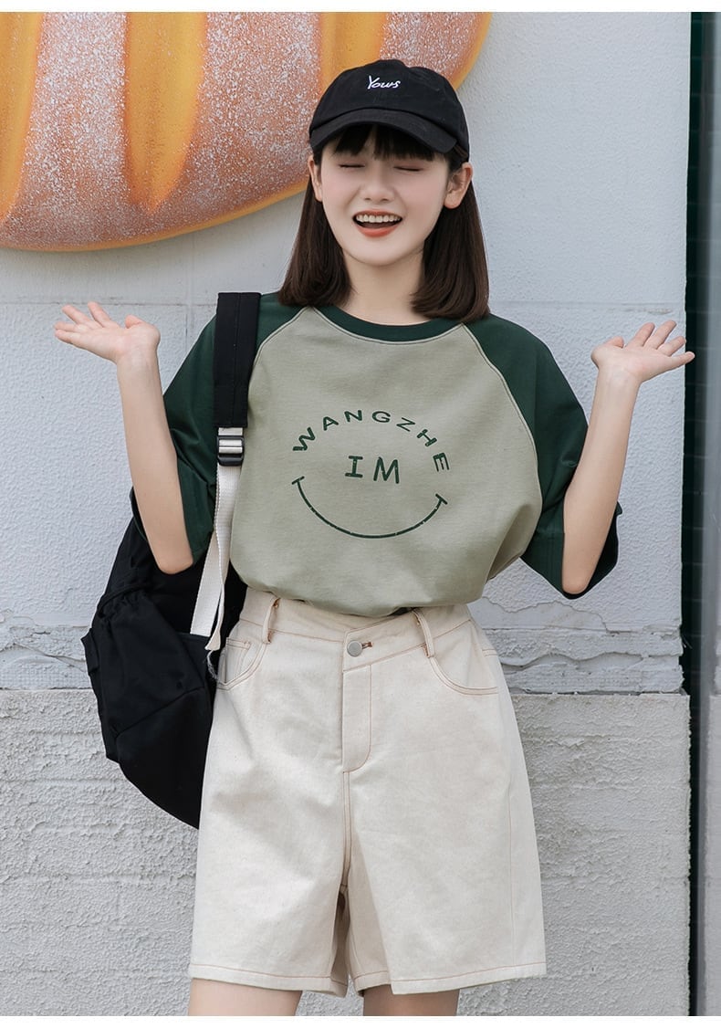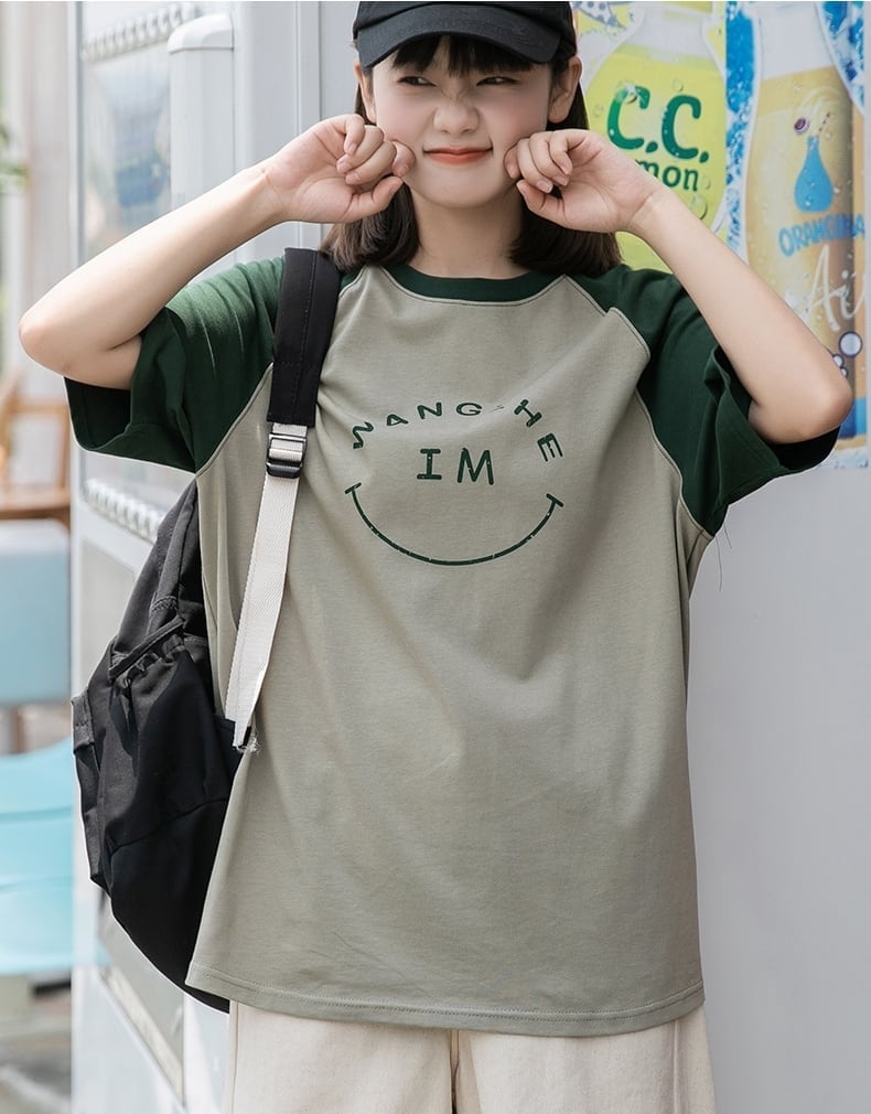 カラーマッチング ラグランTシャツ スマイル アルファベットプリント半袖 <ins-2972>