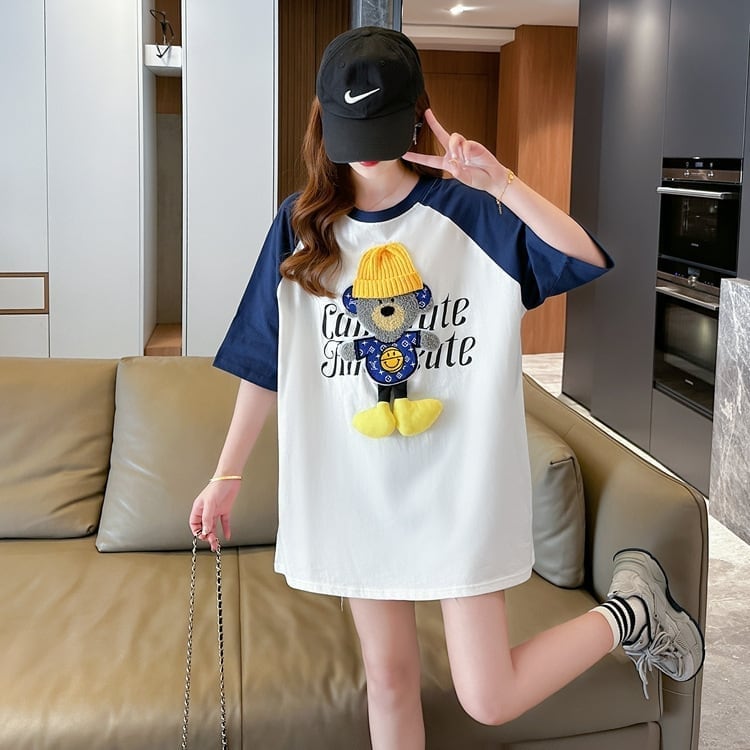 大注目 カラーマッチング ラグランTシャツ クマちゃん アルファベットプリント半袖 <ins-2970>