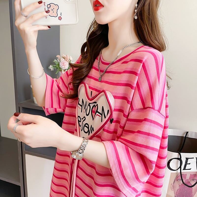 韓国風ピンクストライプゆったり立体装飾半袖Tシャツ<ins-2985>