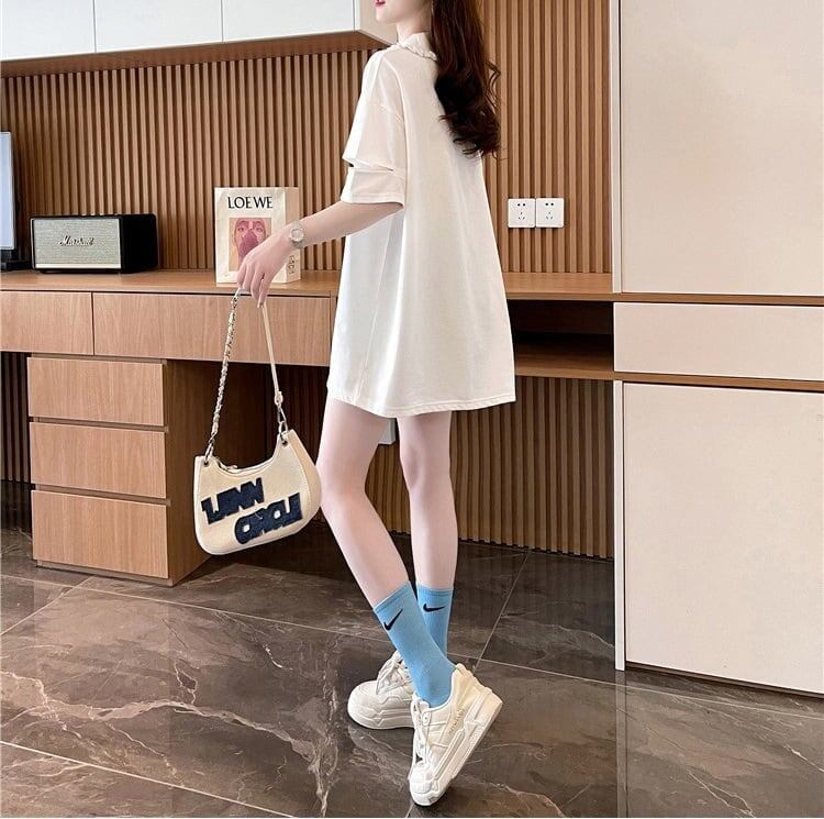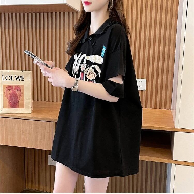 美人度アップ 可愛いウサギちゃん 折り襟 プリントロング Tシャツ ゆったり半袖 <ins-2956>