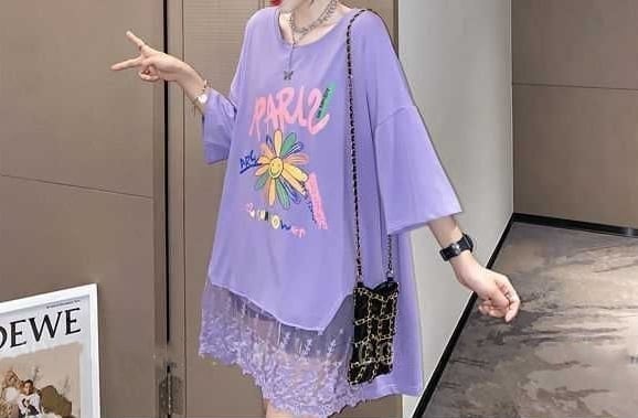 スウィート レース 花柄 アルファベット プリント ロングTシャツ ゆったり半袖<ins-2952>