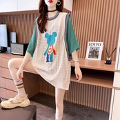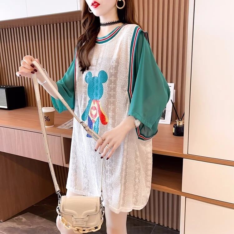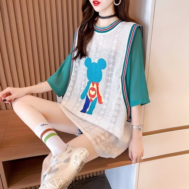 夏新作 ベアー レース カラーマッチング ロングTシャツ ゆったり5分袖 <ins-2942>