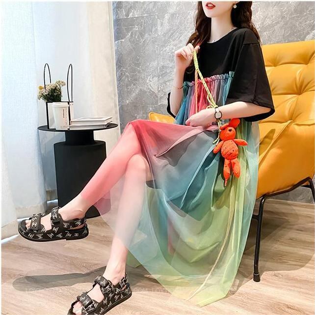 デザインセンスレインボーメッシュステッチ半袖Tシャツ<ins-2940>