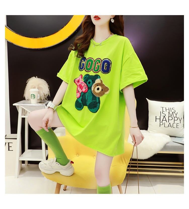 重工業スパンコール外国風おしゃれ植毛刺繍クマ半袖Tシャツ<ins-2911>