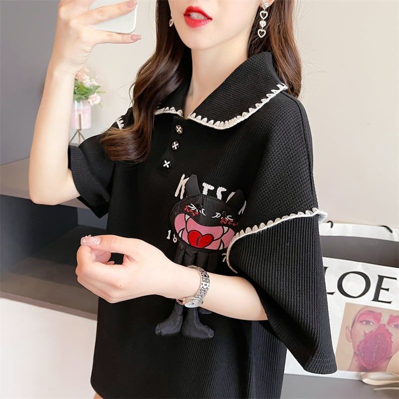 美人度アップ ワッフル 折り襟 ぬいぐるみ付き ロング Tシャツ ゆったり半袖 <ins-2930>
