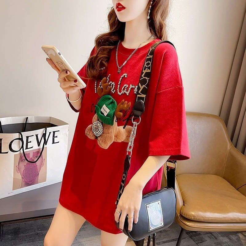 大活躍 ビジューロゴ ロング Tシャツ ゆったり 半袖 三色<ins-2922>