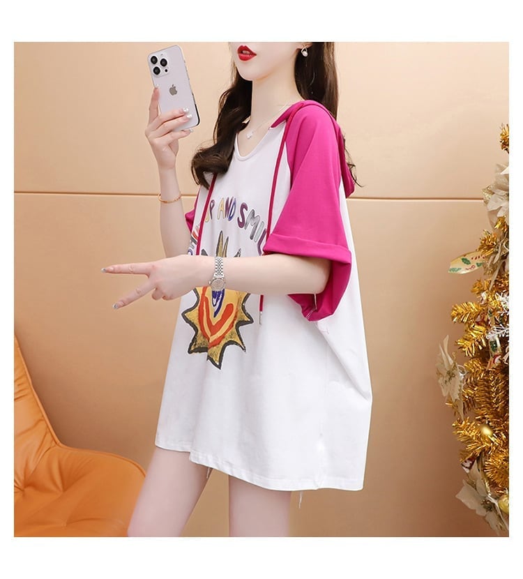 夏新作 カラーマッチング フード付き ラグランスリーブ プリント半袖 パーカー <ins-2918>