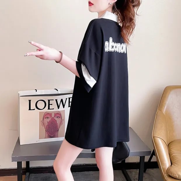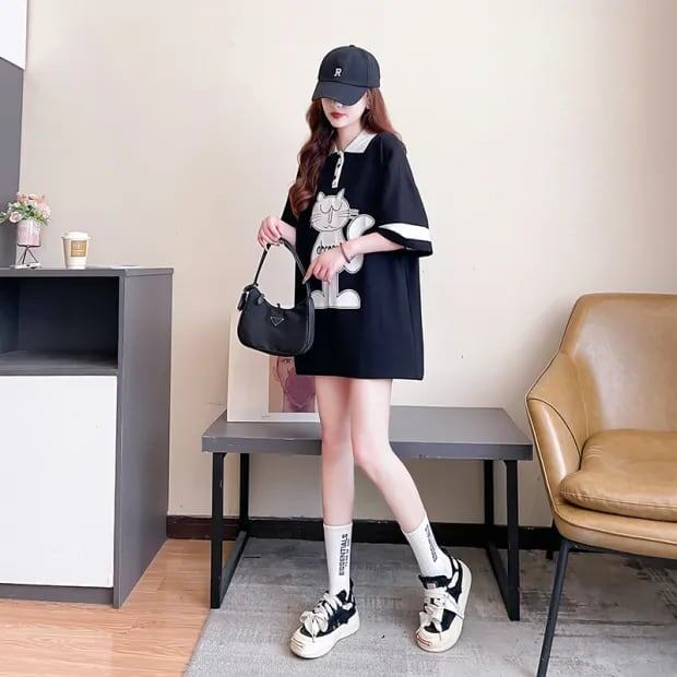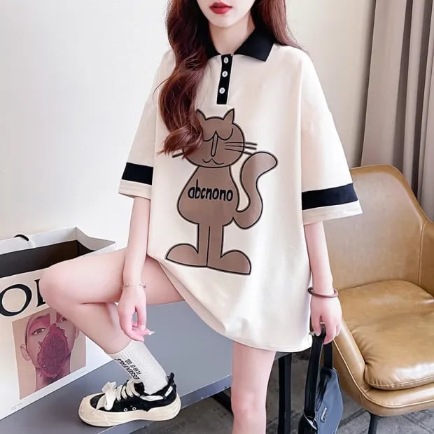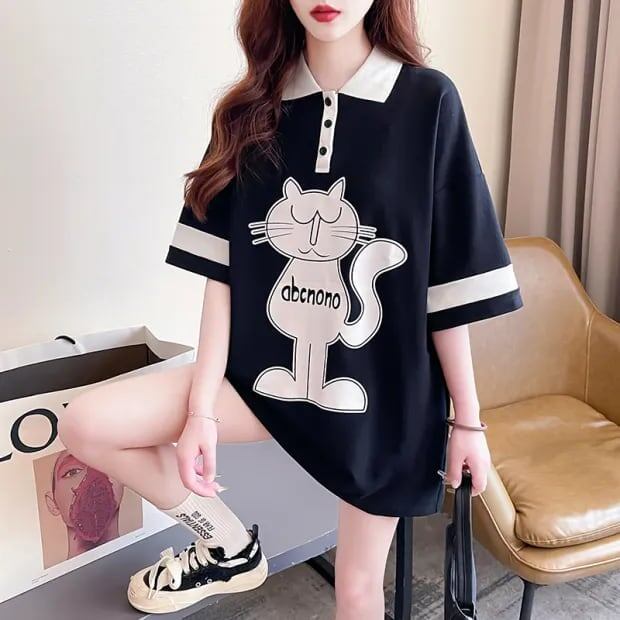 韓国系 POLOネック 猫柄 ロング プリントTシャツ ゆったり半袖 <ins-2894>