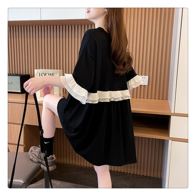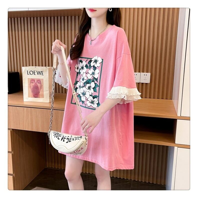 優しい雰囲気 フリル切り替え プリント ロングTシャツ ゆったり半袖<ins-2891>