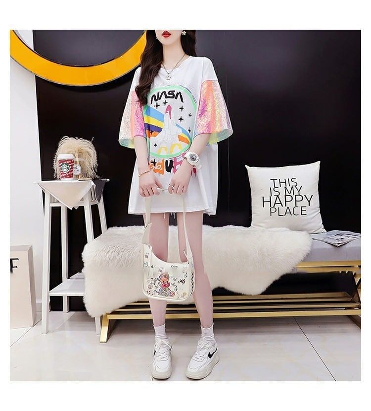 大好評 スパンコール切り替え プリントTシャツ ゆったり半袖<ins-2890>