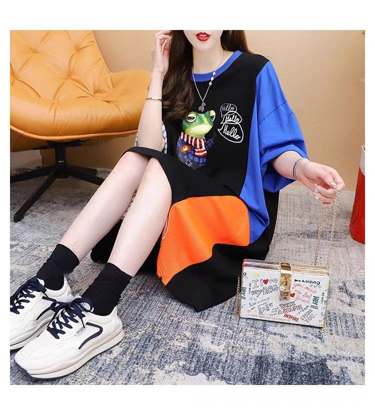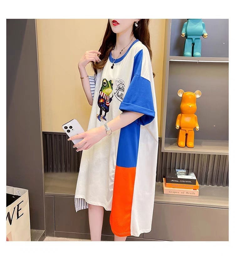 レイジーカジュアルプリント半袖Tシャツルーズデザインワンピース<2879>