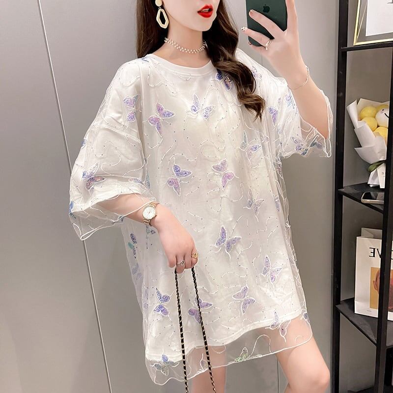 イントレンディなメッシュフェイクツーピースバタフライTシャツルーズトップ<ins-2858>