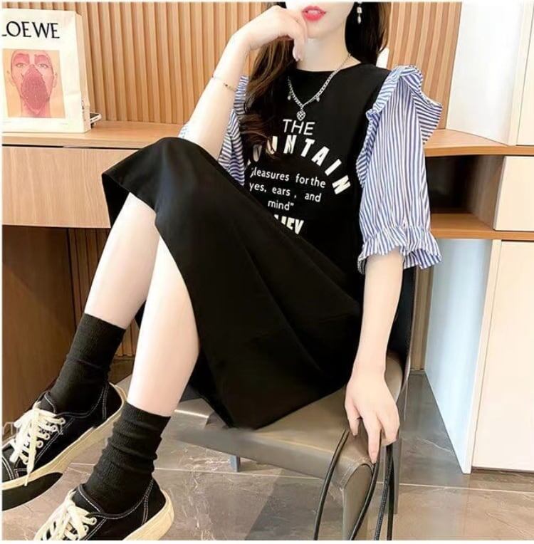 夏新作 スカラップスリーブ カラーマッチング ロング Tシャツ ゆったり 5分袖 <ins-2854>
