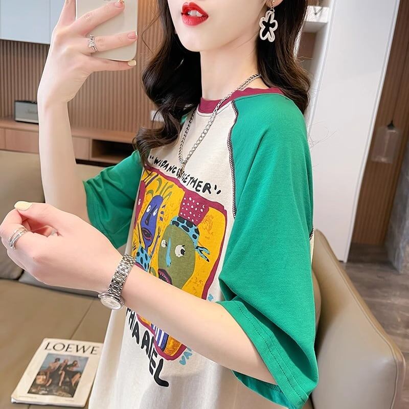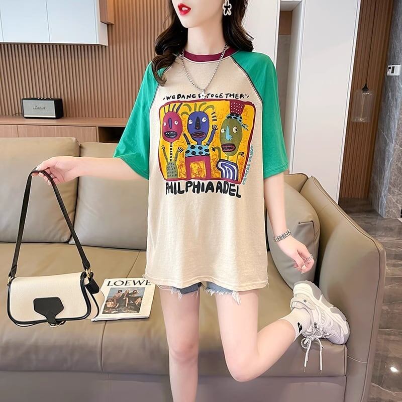 デザインセンスアメリカンレトロ漫画プリント半袖Tシャツニッチカラーマッチングトップスイン潮<ins-2872>